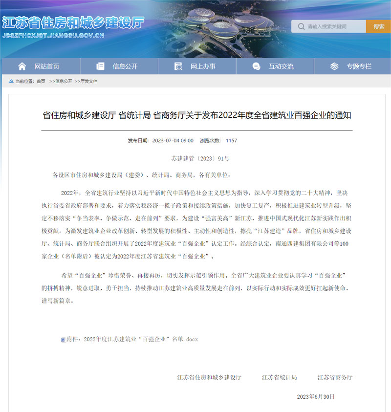 7月4日,江蘇省住房和城鄉(xiāng)建設(shè)廳公布2022年度江蘇省建筑業(yè)“百?gòu)?qiáng)企業(yè)”名單,我公司再創(chuàng)佳績(jī),榮獲“2022年度江蘇省建筑業(yè)百?gòu)?qiáng)企業(yè)(基礎(chǔ)設(shè)施類(lèi))”榮譽(yù)稱(chēng)號(hào)。
