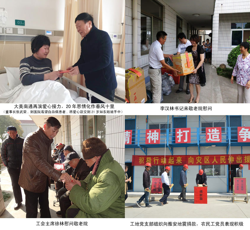 公司成立二十五年以來(lái),從初期連續(xù)十年支助二個(gè)孤兒開始,先后資助新疆伊犁多名貧困學(xué)生,連續(xù)多年看望慰問(wèn)幸福敬老院、秦灶敬老院、唐閘敬老院、市北養(yǎng)老中心的老人,對(duì)素不相識(shí)的癌癥病人、重危病人、交通事故致殘人員、燒傷燙傷等病人給予醫(yī)療費(fèi)支助,向四川汶川、雅安、青海玉樹、云南魯?shù)榈卣鹫饏^(qū)和鹽城6.23特大龍卷風(fēng)等災(zāi)區(qū)積極捐款,樂(lè)施港閘市政人的援助之手,為使愛(ài)心傳承更久遠(yuǎn),施援更高效,公司已分別在南通市慈善總會(huì)、港閘區(qū)慈善總會(huì)冠名了各100萬(wàn)元的愛(ài)心基金,為特困人群雪中送炭,讓愛(ài)的種子、好人文化在港閘市政薪火相傳。